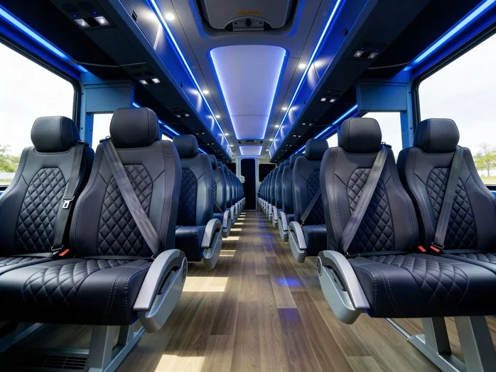 +Every Roswell charter bus in our network can be equipped with premium amenities such as high-speed WiFi for the 30-minute commute to downtown Atlanta, individual power outlets at every seat, plush reclining seats, and extra legroom for taller passengers. You'll also find massive overhead and undercarriage storage for sports gear or luggage, and we offer ADA-accessible features like hydraulic wheelchair lifts and widened aisles upon request. With a 25-passenger minibus rental, you'll still enjoy comfortable seating, individual climate controls to combat the Georgia heat, and overhead storage-ideal for quick trips to the Roswell Cultural Arts Center or nearby North Point Mall. Full-size motorcoaches are the premier choice for long-distance travel, offering an onboard restroom, multiple video monitors, and space for up to 56 passengers.
